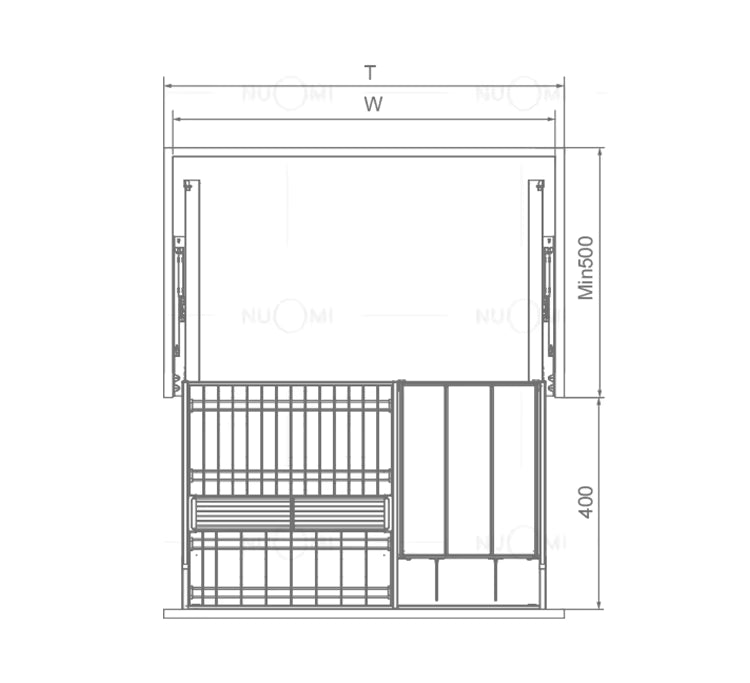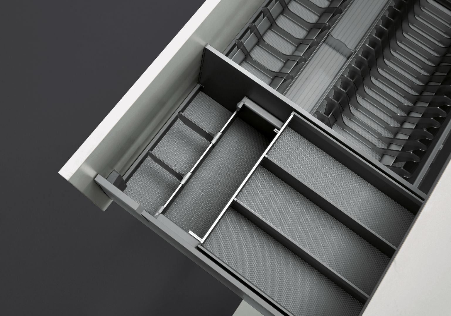 Ultra slim aluminium alloy profile with fluorocarbon coating surface treatment. Double Layer with inner cutlery tray, better organized design, make the best use of cabinet space. Anti-slip bottom, avoid noise and items collision during sliding.