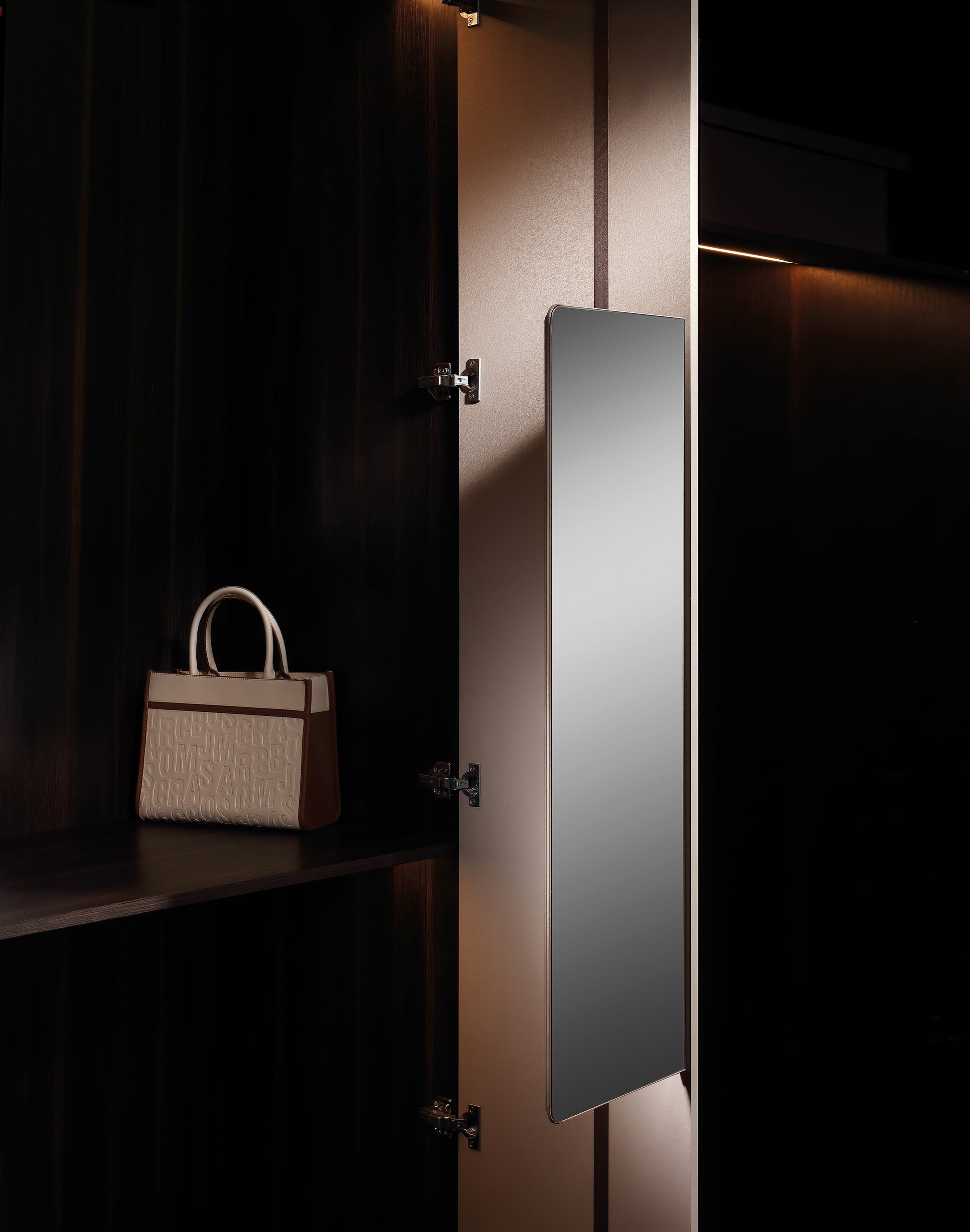 Designed to be hidden inside your wardrobe, this mirror slides out effortlessly when needed and rotates 90 degrees for optimal viewing angles. When not in use, it tucks neatly away, saving space and maintaining a clean, clutter-free look.