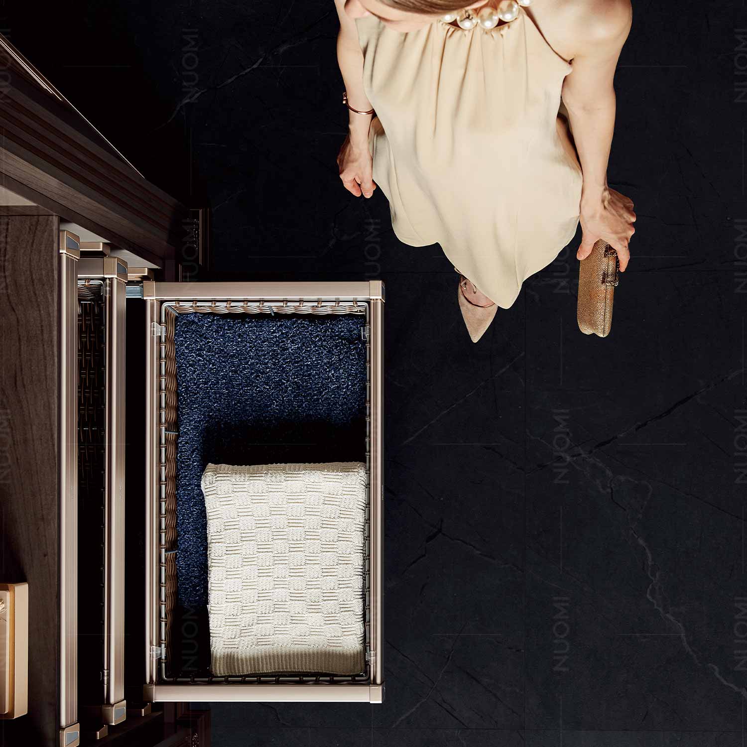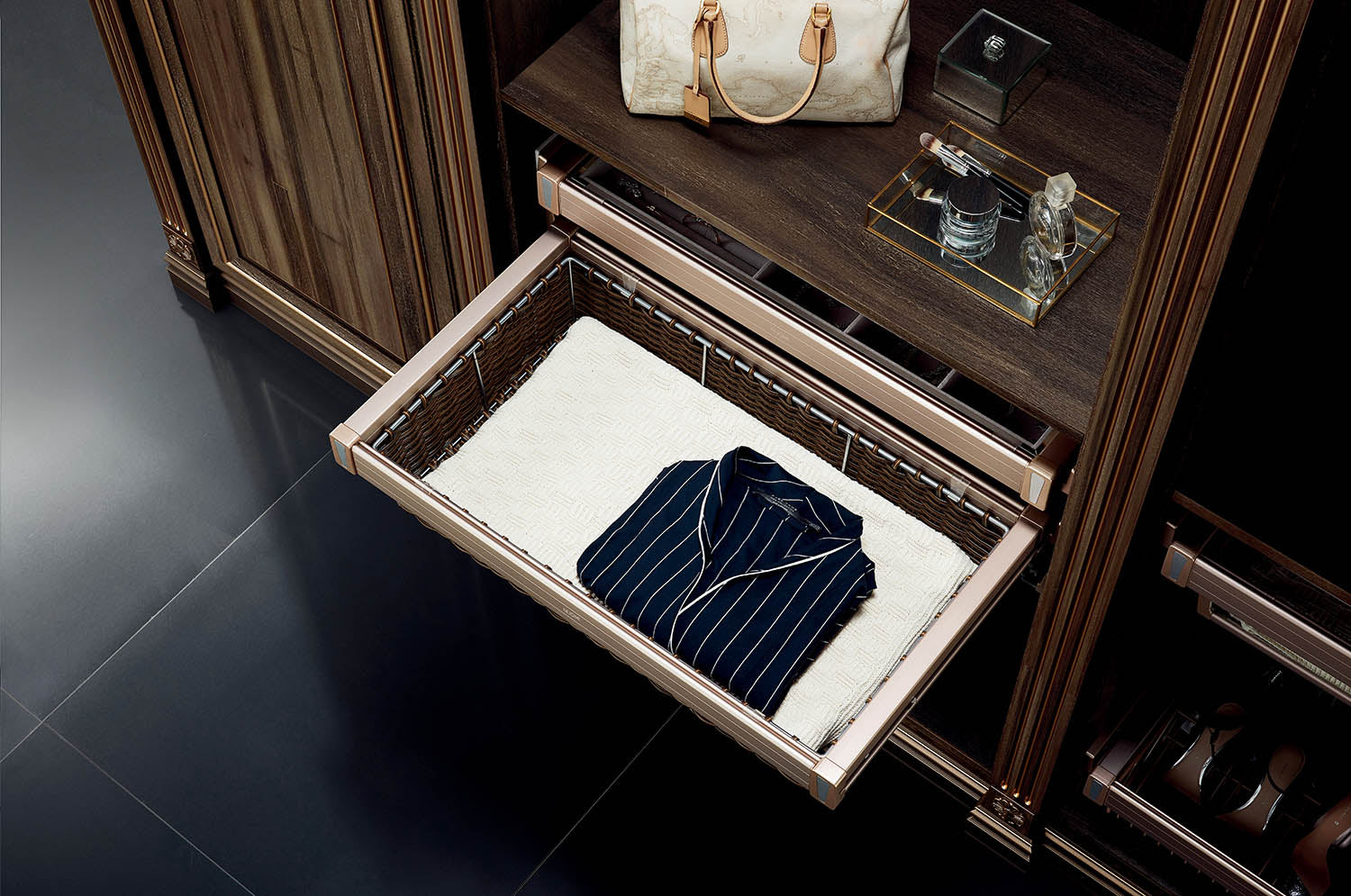 • A rectangular pull-out drawer basket designed for installation in a wardrobe